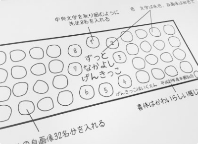 手描きの似顔絵、寄書き文字、レイアウト案がある場合。