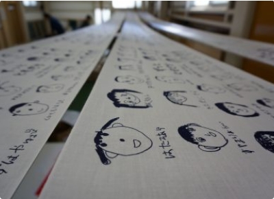 原画はスキャナで取り込んで加工しますので、白い紙に黒いインクでお描きください。寄せ書き手ぬぐいは10cm程度の紙にそれぞれの似顔絵をお描きください